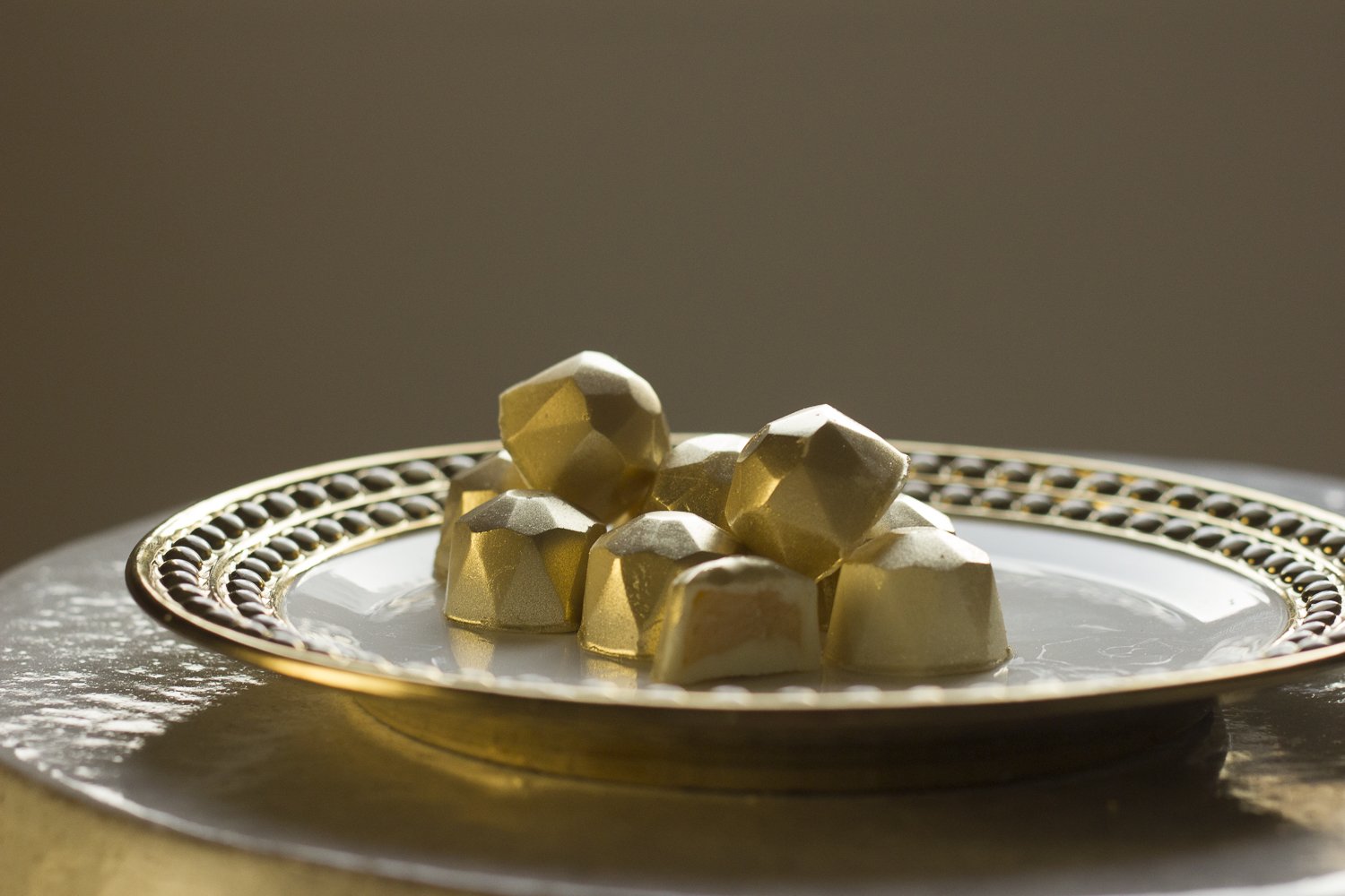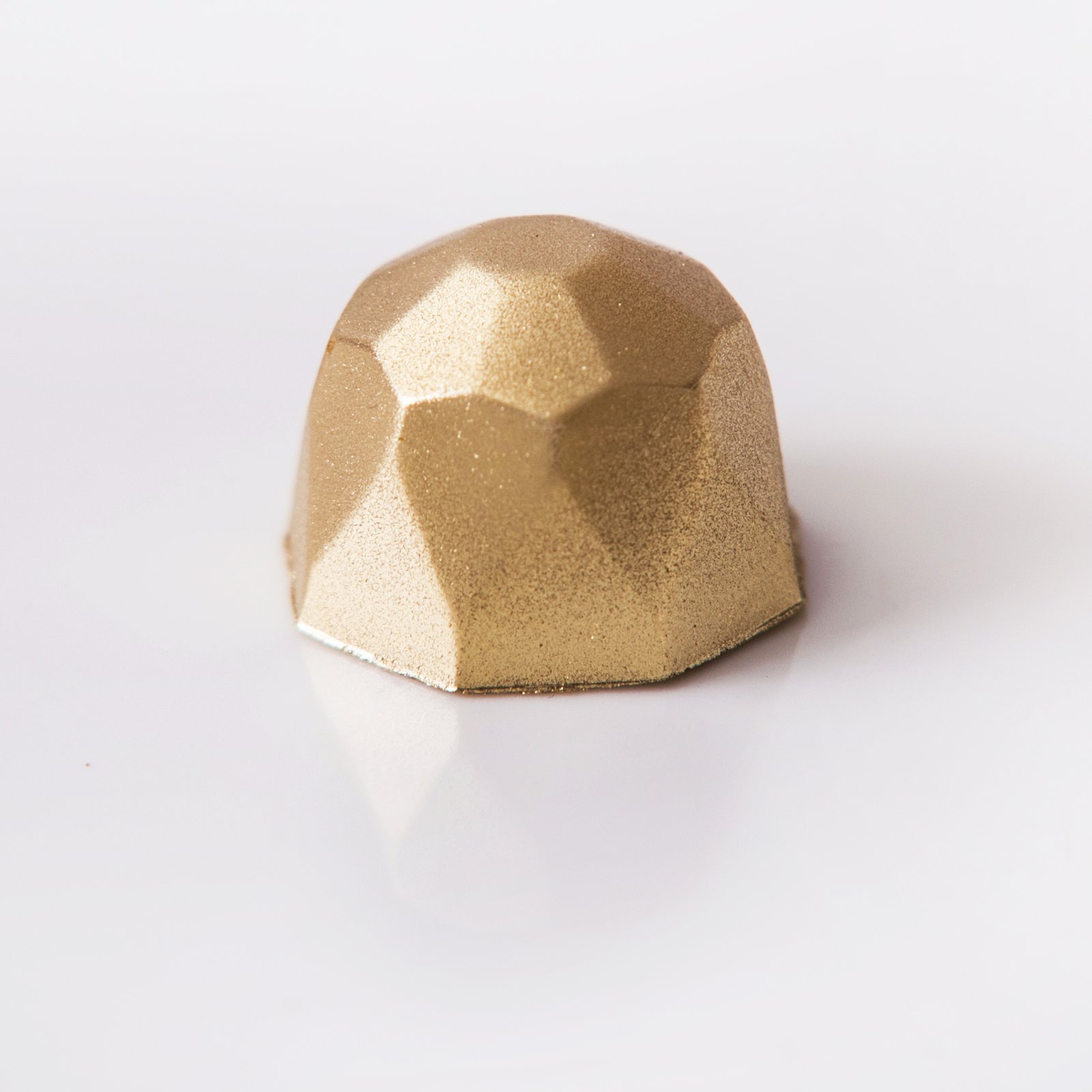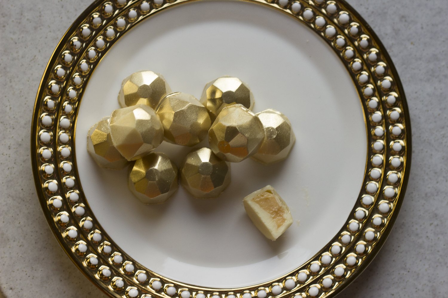 Bombom de chocolate branco com recheio de pasta de champagne.
