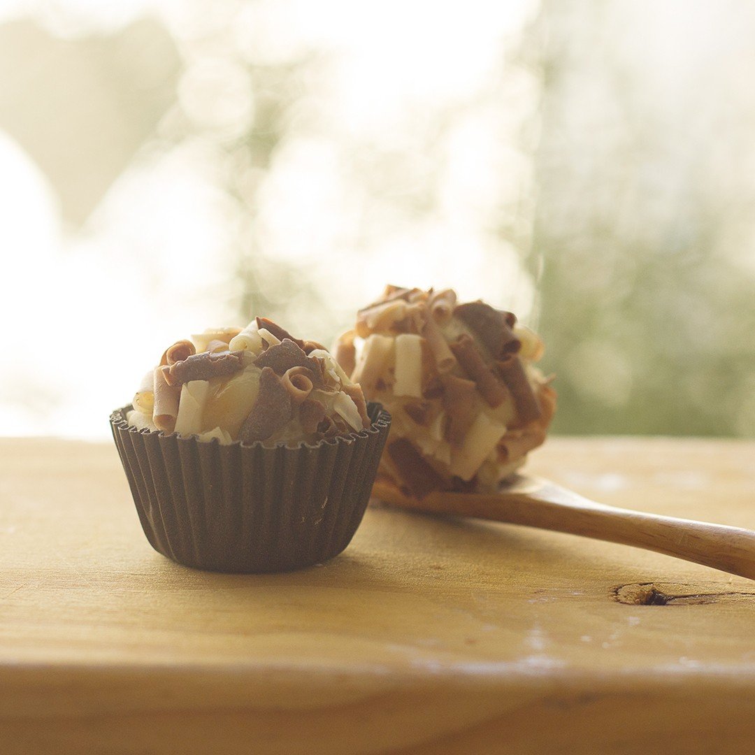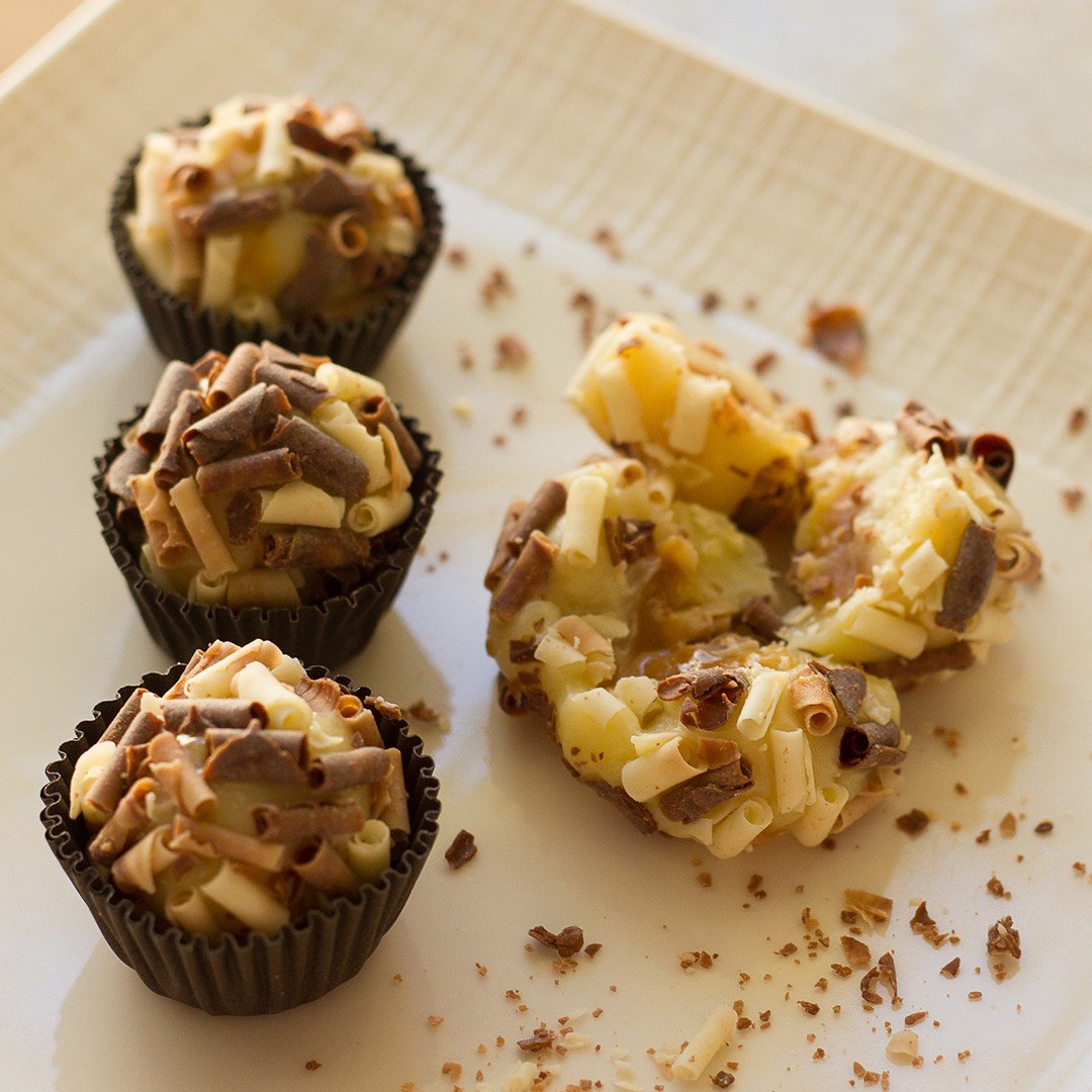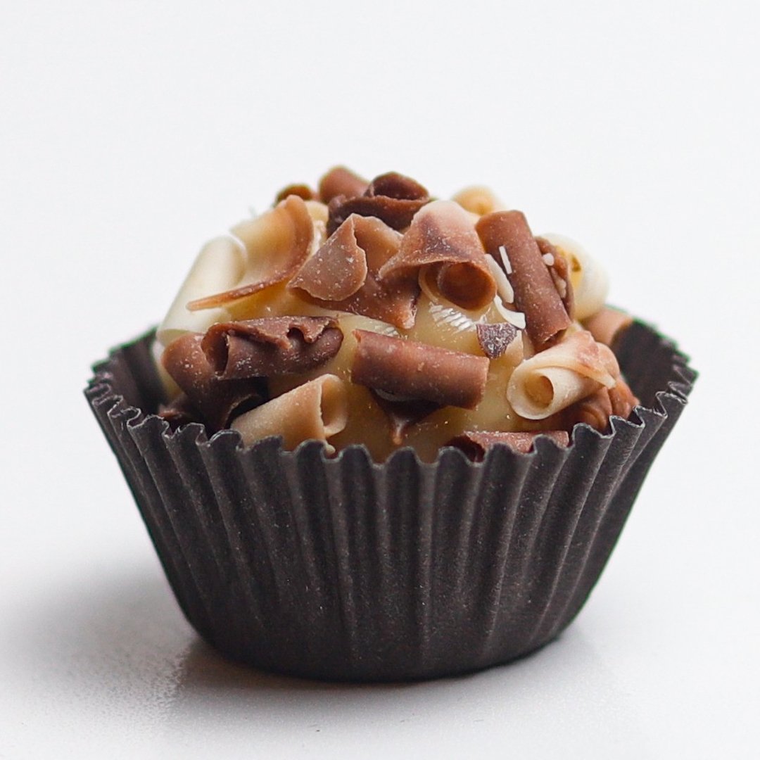 Brigadeiro de chocolate branco com doce de leite coberto com blossoms duo.