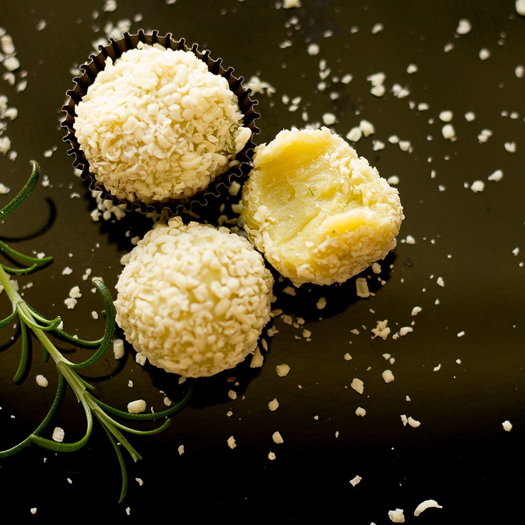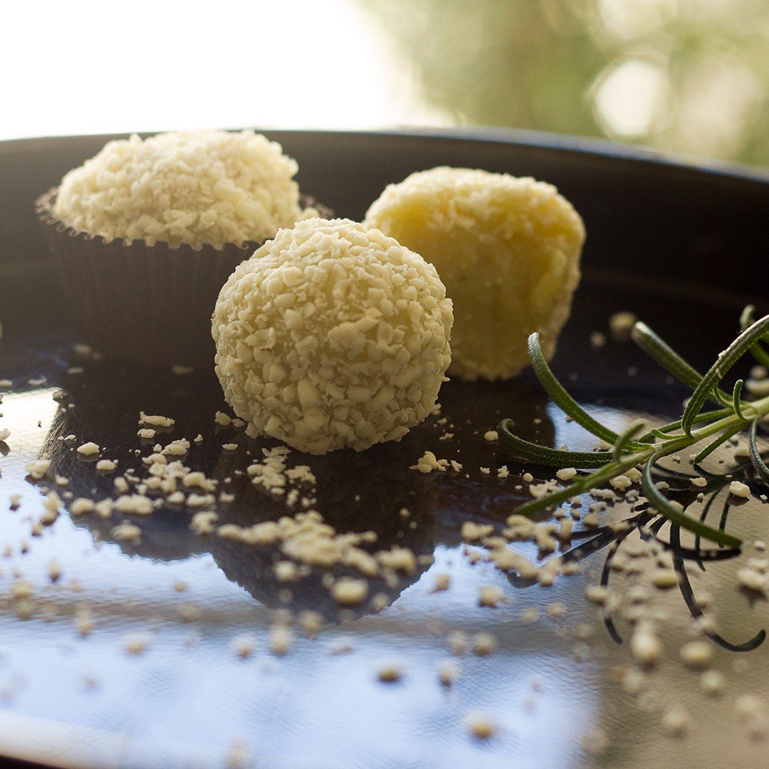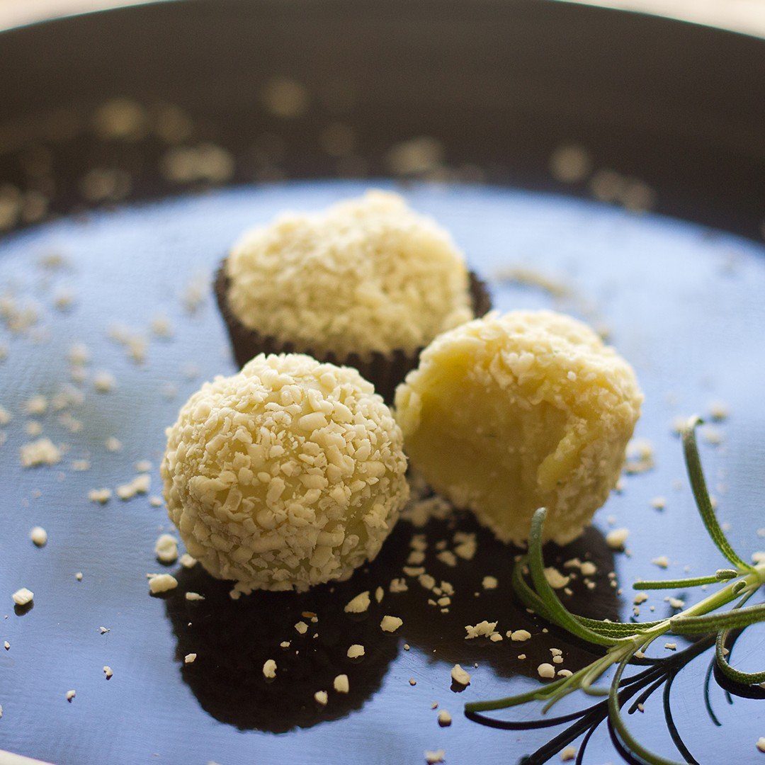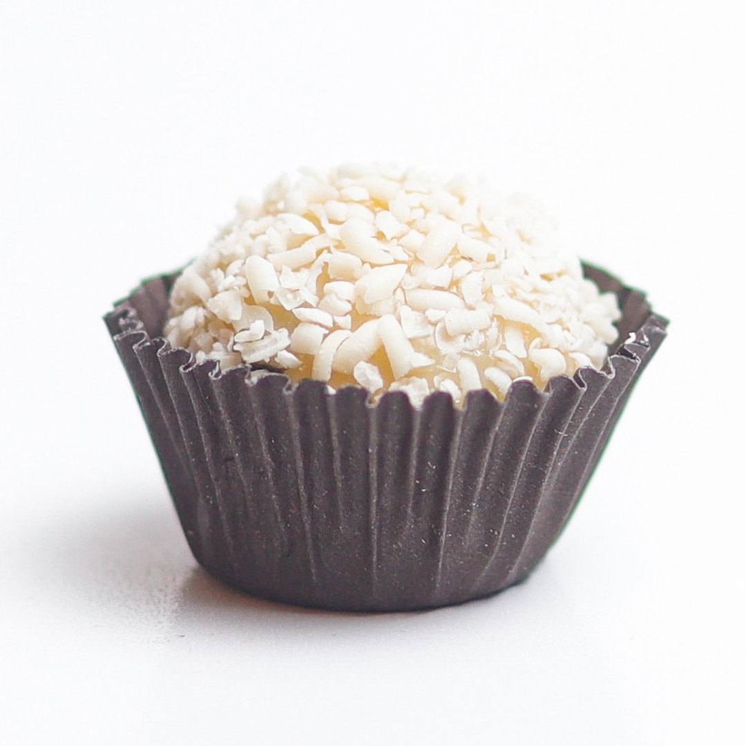 Brigadeiro de capim santo coberto com raspas de chocolate belga branco.